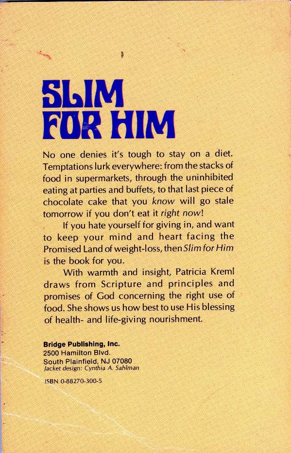 We have had more than a few Christian diet books. Remember Help Lord – The devil wants me fat? Or how about diet advice for the ladies with More of Jesus, Less of me? And of course, one of our personal favorites: Jogging for Jesus. Unlike those titles, Slim for Him doesn’t have any specific health advice and doesn’t claim any outrageous health cures, just scripture and inspiration which probably makes this the best of these books.