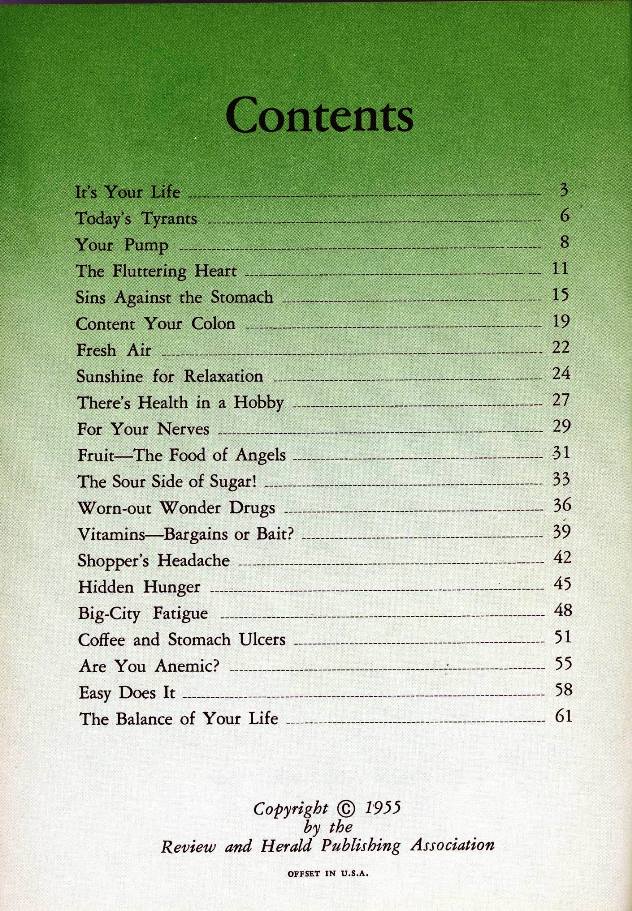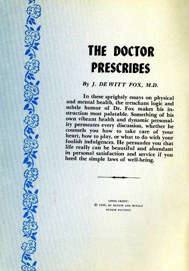This is one of those small booklets that advise patients on basic wellness. In other words, what to do when you are stressed-50s style. Phones and deadlines are “lethal weapons designed to commit civilized suicide”. The basic prescription is fresh air, eat right, go to bed early and get up earlier.