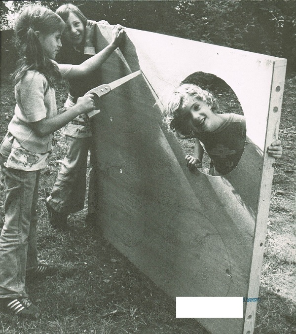 My favorite is the kid with his head sticking out the soon-to-be window, with a saw aimed at his face. There are no safety glasses being worn in any of the pictures and no gloves while digging through the vat of rust and splinters for The Junkyard House materials.