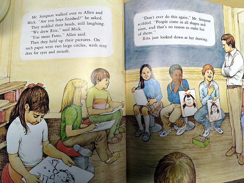 Submitter: This is a “sensitive” story about Rita who is overweight. Rita has to face being weighed in front of her entire class and being told she needs to go on a diet. She then is bullied by her classmates in art class and swim class. She uses food to deal with her emotions. But after some effort, Rita finally looses weight where she is told she is a healthy girl and no one bullies her anymore.