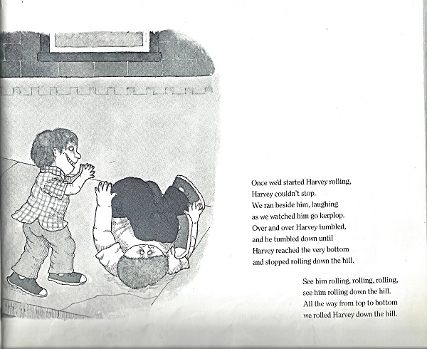 Submitter: This is another children’s book that was initially pulled because of its condition. It has had a lot of circulation since it was acquired in 1989 but only 2 circulations in 20 years. On closer inspection, the book sent up all kinds of red flags. The “story” is about a group of boys who are friends told through poetry. The book could easily be renamed “Boys will be boys,” but it is pretty hard to excuse the bad behavior described in the book. They pick on and make fun of other children, attempt smoking, fight, break windows, pick noses, etc. Harvey has the worst behavior and goes so far as to tie two of his friends to a tree and pull their pants down! Finally, the other boys become fed up with Harvey and decide to roll him down the hill.