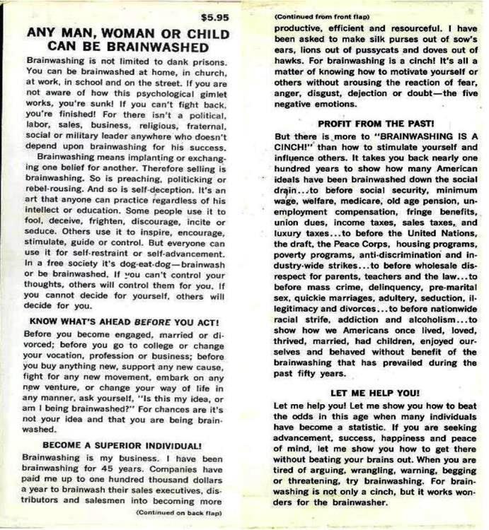 Of course I am interested in any book that would allow me to bend people to my will. (The longer I am in this profession, I realize that I really want to be a librarian dictator.) Our author defines brainwashing as substituting one belief for another. By using the power of suggestion and saying things a bit differently, you can control the people around you. Sure. Whatever.