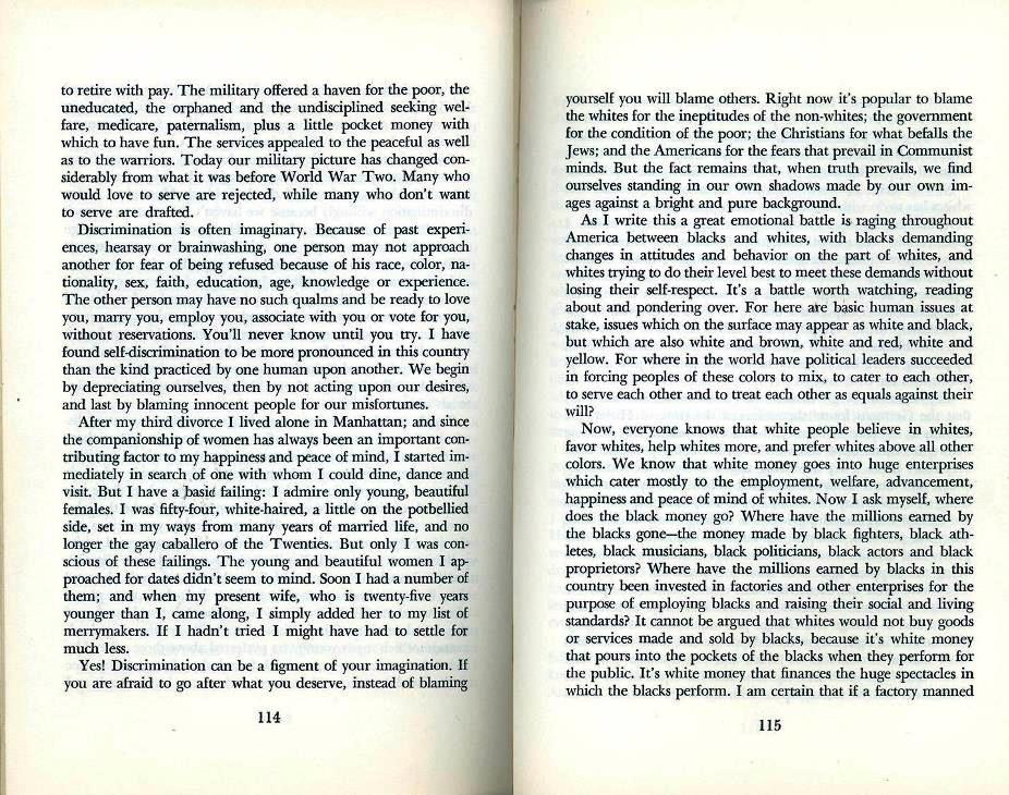However, the second half of the book is crazy on a whole new level. Our guy has a bunch of ideas and he is here to educate us all on the American way of life. Evidently, the poor, minorities, and women aren’t understanding how much good white men do for them. We have been brainwashed into thinking that there is a problem in how the American way of life works.