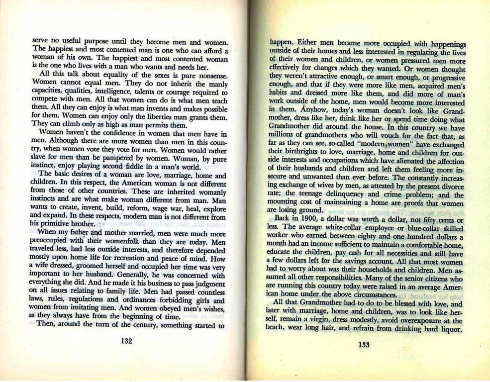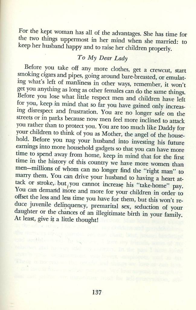 Take a look at some of the text. Poverty is a good teacher and an “honorable way of life.” Evidently, poor people and minorities are not appreciative enough of the concept of opportunity. He doesn’t stop at poverty and racism, there is also another diatribe on how women have “lost ground.” The ladies need to appreciate that the men are the ones that teach them and provide for them. Men should be the breadwinner and women keep house. Note his letter to the ladies about their greed and other failings. Even violence on the street is the fault of these mothers. (How can men respect them when they do this?)