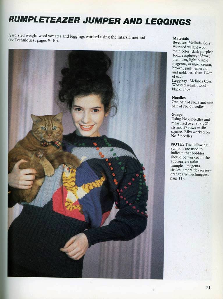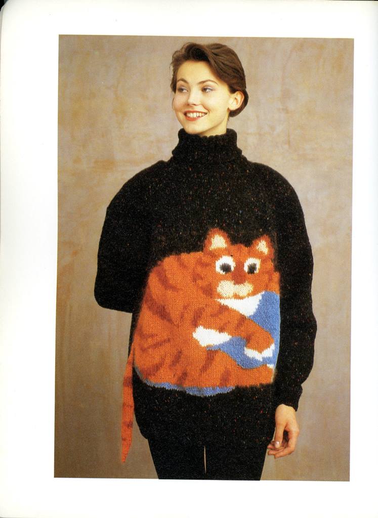 Who wouldn’t love to get their needles going on a big sweater that emphasizes the caboose by planting a semi-pissed off cat right in the center. How flattering! If you want to look like you are pregnant with an orange cat, check out the second picture below. Note the attached tail!