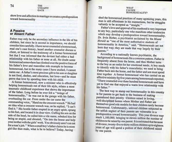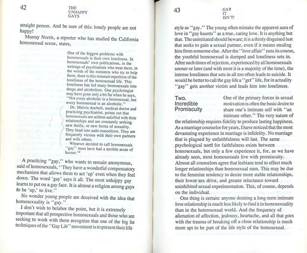 Most of you should be familiar with Tim LaHaye, author of the Left Behind series of books. This evangelical Christian minister wrote this in the late 1970s, not so coincidentally at the same time Anita Bryant was openly criticizing the gay liberation movement. In fact, we featured her treatise on the evils of gay people on this site 2 years ago. LaHaye lavishes praise on Anita’s good works standing up against those militant gays.