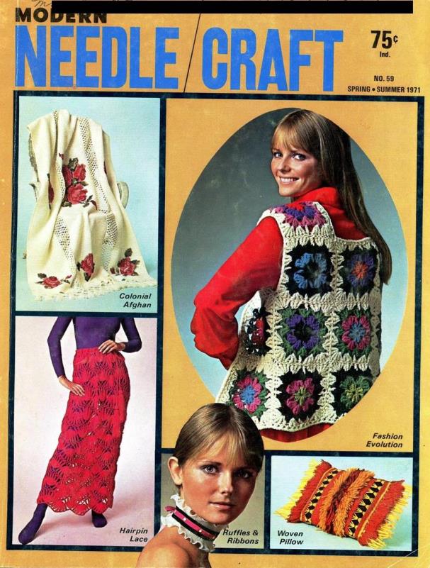 Time to get your craft groove on. For the crochet crowd, take a look at the granny square “fashions”. I know the men will want to get a granny square tie. I am not sure that granny squares = groovy mod fashion. Just about every couch in America probably had some kind of afghan within reaching distance in the 1970s and into the 1980s. The ponchos and vests might work depending on colors, but I am not sure a poncho works as a skirt.