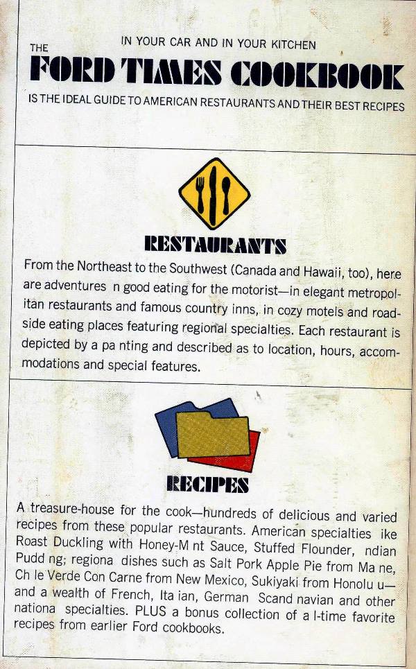 This is the second Ford cookbook we have featured on our site. They are part travel guide and part cookbook. I like these types of retro cookbooks as they also talk about the restaurants. Since restaurants come and go, this is a book that probably should be regularly weeded and updated. However, they are interesting books that deserve some place in an archive. These books are a snapshot of a certain time, and what was considered a signature dish. So keep it for memories but weed it for currency.