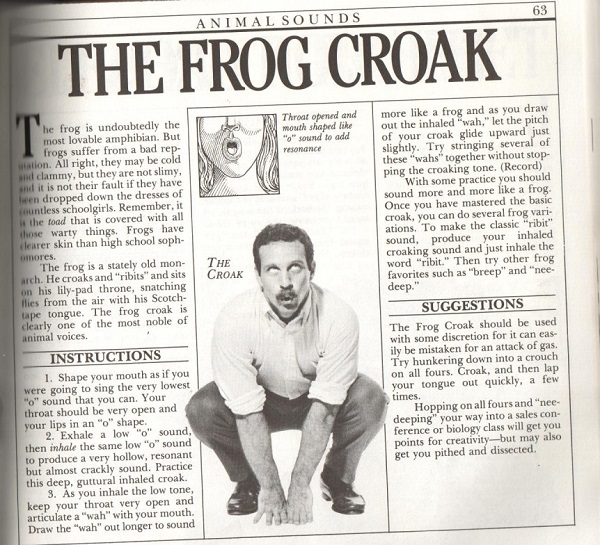 Holly: That subtitle! I’m not sure whistles, pops, clicks, and honks are the best way to social success. Although that thing people do when they flick their cheek and it sounds like dripping water is kind of cool, I guess. The free record included with the book is not as enticing as it once was either. There’s some good advice in the frog croak section (below): use this sound with discretion because it can be mistaken for an attack of gas. Ha!