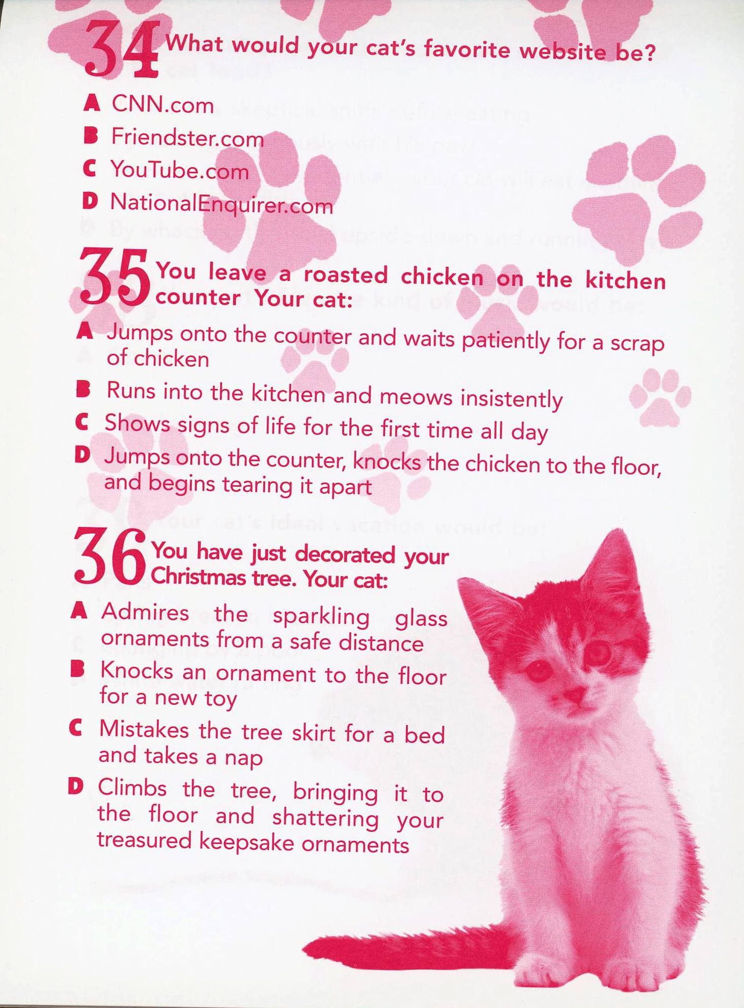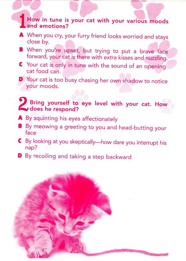 As a book, this barely qualifies. It really is just a quiz and it is more like a funny party favor than anything a library would want to add. I do think that cat books are essential for both adults and kids. I know it is futile, but I always hold out hope that some cat person out there finally has them figured out.