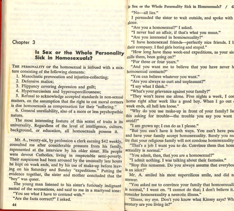 Another evils of homosexuality book. We have published quite a few over the years, including this horrible picture book. This one is worse as it is buried in unsubstantiated “scientific” claims. His “expert” opinion is buried under anecdotes and pyscho-speak that would scare anyone into thinking that every gay person is out there recruiting YOUR child into this evil lifestyle. I think this is outrageous, even for 1956, although I shouldn’t be surprised, since many of the books we have featured have trotted out many of the same arguments.