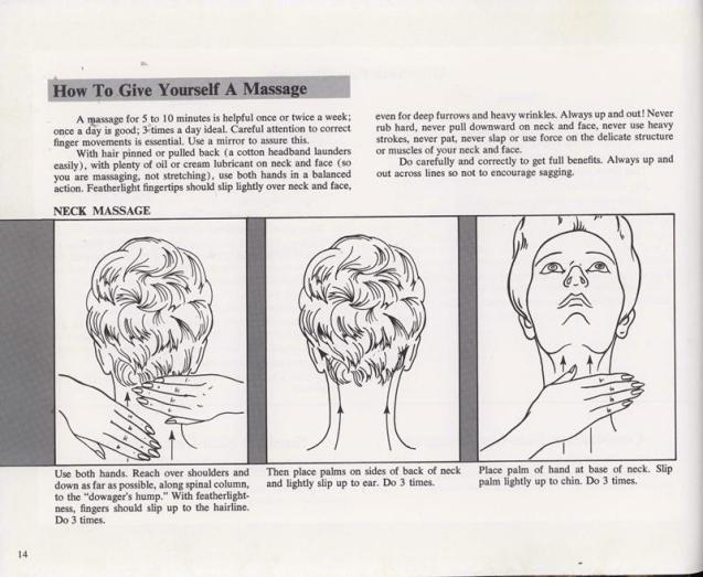 This book has page after page of facial exercises that will enhance your beauty and make you younger. I tried a couple of these. Nothing happened other than me feeling foolish. However, keeping an open mind, your mileage may vary. One of my favorite pieces of advice is to not make your face too expressive or you may get lines in your face. Maybe this is a warm up to Botox treatments.