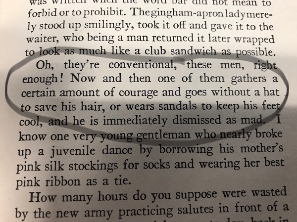 Let’s, however, give Mr. Cobb credit. He was an equal opportunity humorist and that’s pretty good for 1920. Among the historical pearls I learned about men include that wearing hats cause hair loss and that boys should never wear their mother’s pink silk stockings.