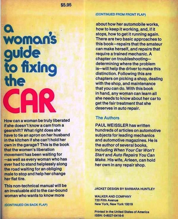 I will bet everyone looked at this cover and without even reading the title and thought: this is a book for the ladies. See the bright pink and purple? That mean it is for the gals. We wouldn’t want them to have to use one of those big heavy, complicated Chilton’s manuals. You can’t truly be a liberated lady without understanding your car. My favorite part is poor Arleen who is a co-author, but look at her mention on the inside flaps. Arleen is reduced to a sentence. I bet she didn’t get paid the same for her contribution to the book.