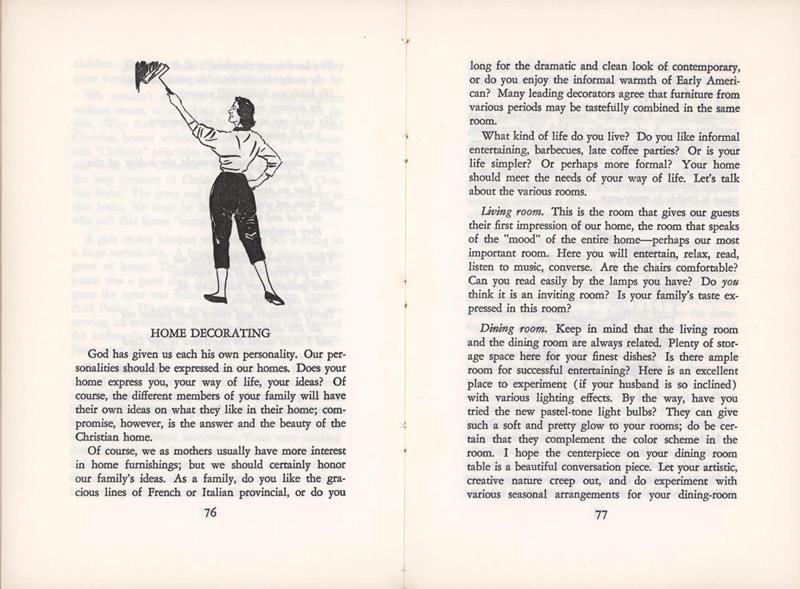This book is some Christian based cleaning and cooking help. Evidently, the way to heaven is a tidy home and some decent meals. Fine. A lot of folks take homemaking seriously. More power to you. It’s the subtle (and not so subtle) implications that a good Christian woman does this and if you don’t, obviously you are not good or not a Christian. The Midwestern folks out there might get a kick out of a hot dish recipe or maybe a recipe for a mayonnaise based salad. Otherwise, it’s time to let this one go.