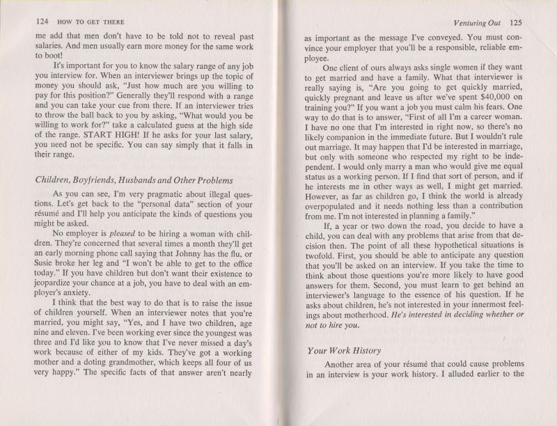 There is advice about presenting a more masculine resume. Supposedly, if you have a hobby like woodworking, it shows that you can comfortably deal with a man’s world. Typical of career books for women, there is advice about office decorum, dress, business lunch, etc.