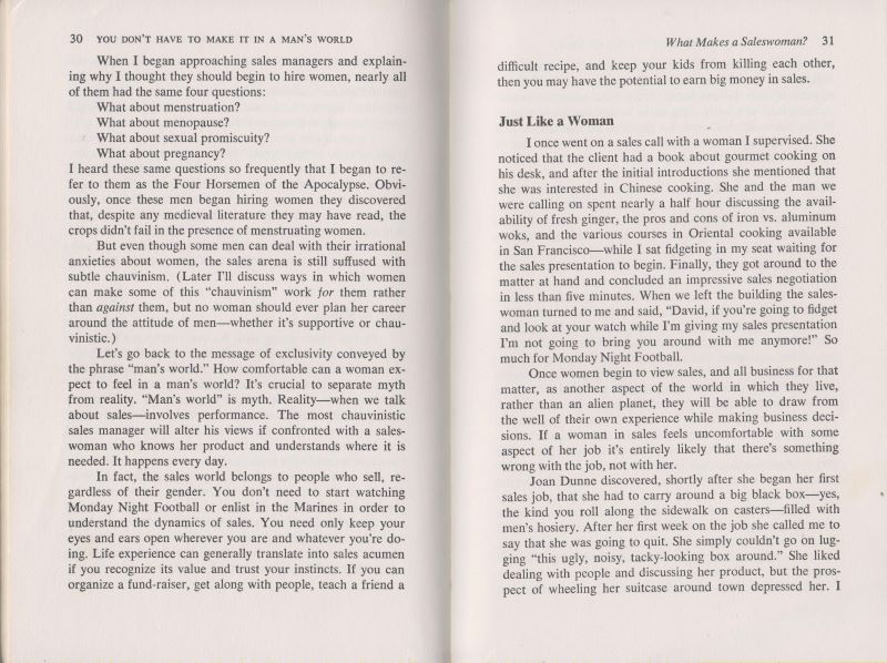 This is one of those relics from the 1970s giving women some career advice. This time it is for a sales career. The book’s general premise is that a sales career can give women a serious leg up financially, and that women do better than their male counterparts. He asserts that women are more talented and intelligent that then men competing for the same jobs. Basically, the author believes that women are an untapped and overlooked resource. Women are supposedly more sociable, nurturing, and better suited to a people oriented career.
