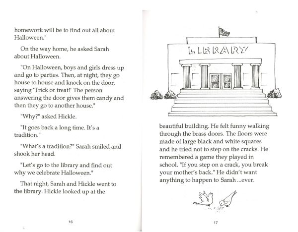 They went to their local library and looked up dill pickles in the OPAC and could only find out how to MAKE dill pickles. No info on the origin of pickles. Librarian tells them to go to a bigger library. (Really? That is the best this librarian can do?) They try the state library. More nothing. Finally, they call a pickle packing company. They send a letter, and a pickle company sends Hickle a book on the history of the pickle. Hickle has fun at school and likes being a pickle.