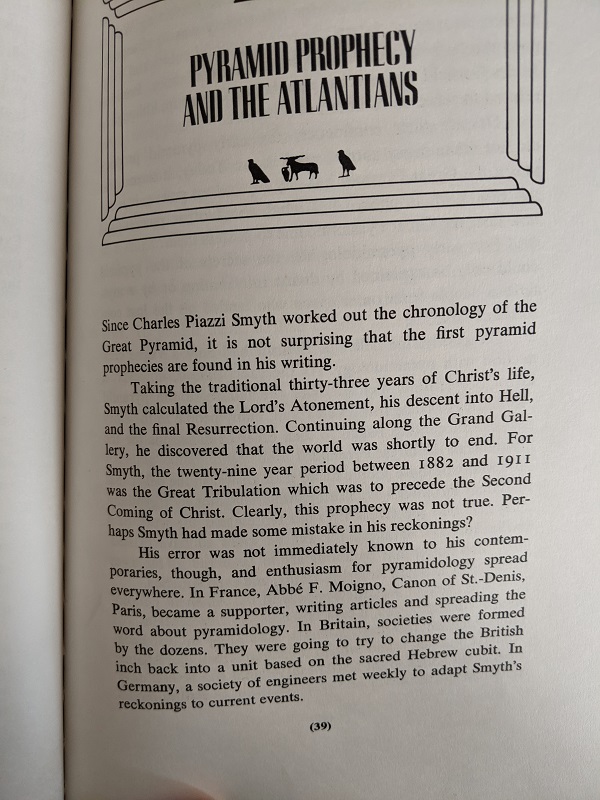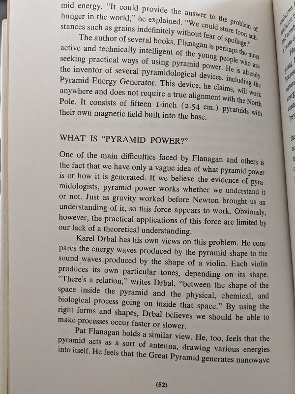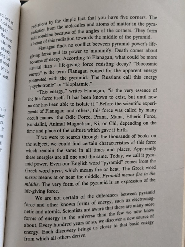 The book then goes on to extoll the powers of pyramids, which include preserving milk, sharpening razors, and growing plants. Really, pyramids seem capable of anything you want them to do! Akins even tells you how to conduct your own experiments to test these powers.