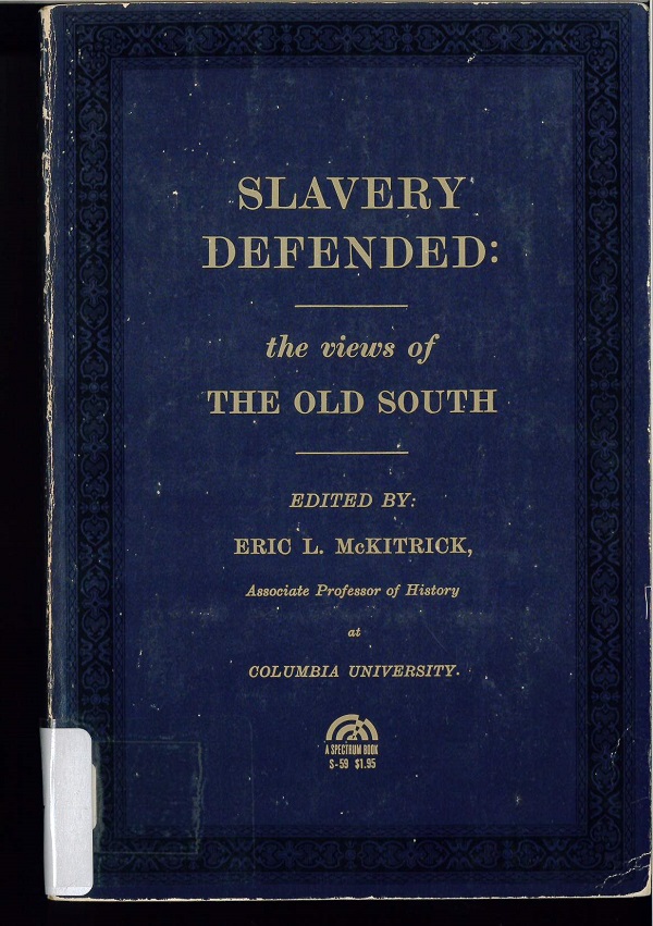 Submitter: We are going through a massive weeding project at our small academic library, and this title came up (thankfully in the titles to be weeded!). Now, granted, I wasn’t alive in the 1960s, but I would have hoped a title like this would have been problematic even then. The judgment call in the title is completely unnecessary – the collection of essays could easily have been called Views of Slavery in the Old South and conveyed the same information. Now, however, the phrasing of the title is not merely problematic but downright offensive, particularly to our students and faculty of color. I’m glad we’re getting it out of the building! As for the content, someone actually wrote an epic-length poem called “The Hireling and the Slave”, which is excerpted (my mind is still blown that 11 pages is just an excerpt) in this volume. I scanned a sample.