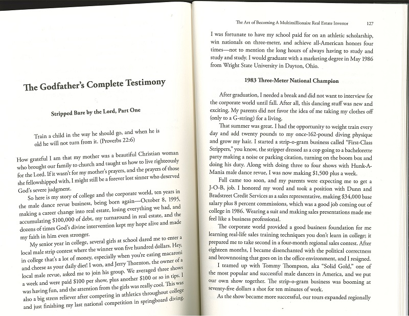 So, I came across this gem in my business section. I think the back cover speaks for itself: body builder to stripper to real estate agent who then marries his “African American Wife.” There’s a lot going on here. I’m also confused as to whether this is a book about real estate investing, a biography, or a gospel. Take your pick! In fact here’s more.