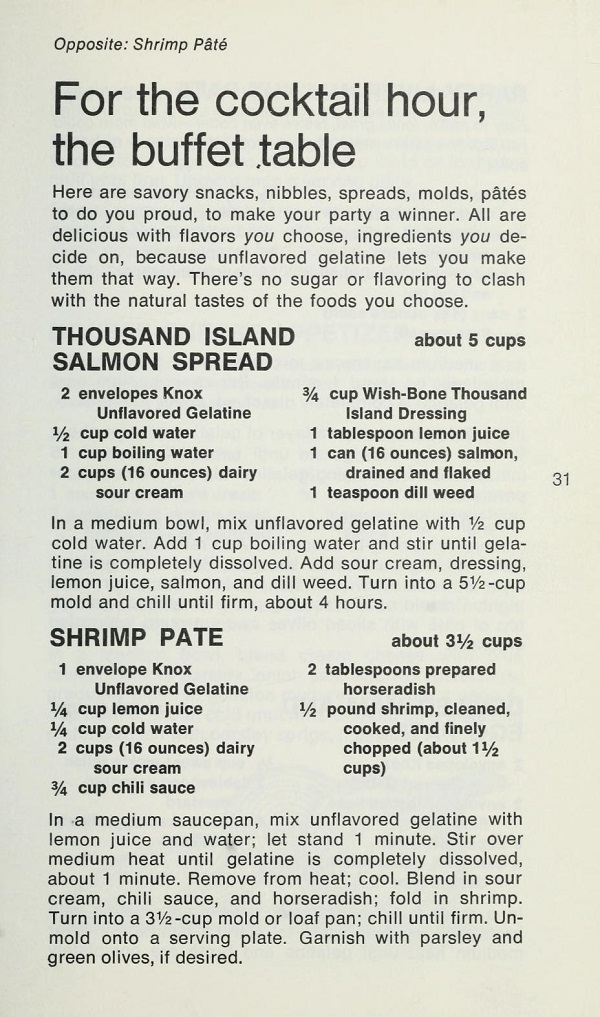 Submitter: Just in time for those summer gelatine/Jello salads – who wouldn’t want calico corn relish, creamy cranberry relish, or a zesty seafood appetizer in gelatine? The pictures just make my…mouth water would not be the right phrase. This one is off to the sale cart.