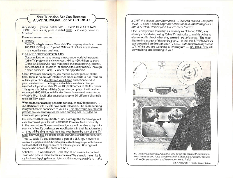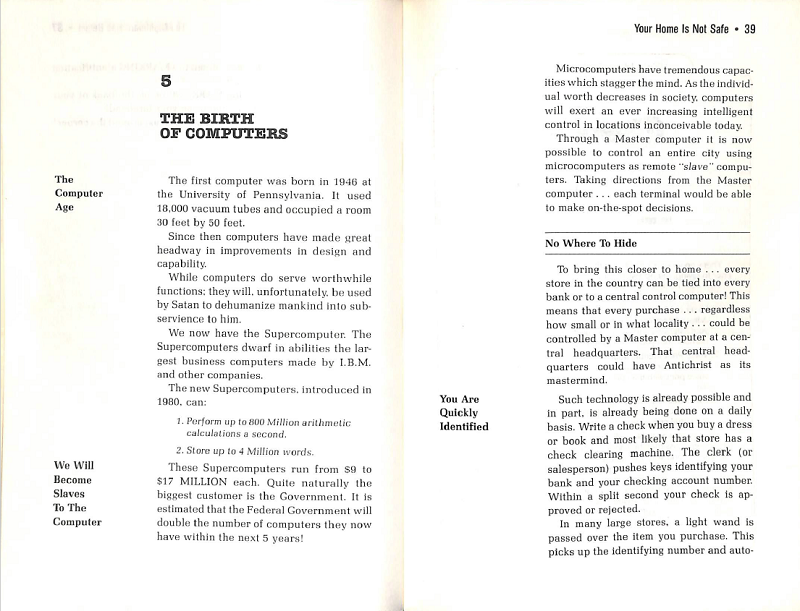 Submitter: This book is one of many from Kirban that outlines the ways in which the world will ‘soon’ come to an end. This particular title is full of outlandish predictions that include cannibal worms, laser identification beams, and of course the word computer (when assigned the proper alphanumeric code) adding up to 666. Not only are we treated to ranting speculations, but also some alarmist images and comics, depicting the doomed direction the world is heading. It’s hard to believe that there are more of these, but as the back of the book claims “Salem Kirban is well qualified to write on future events. He is the author of more than 30 books on the subject.”